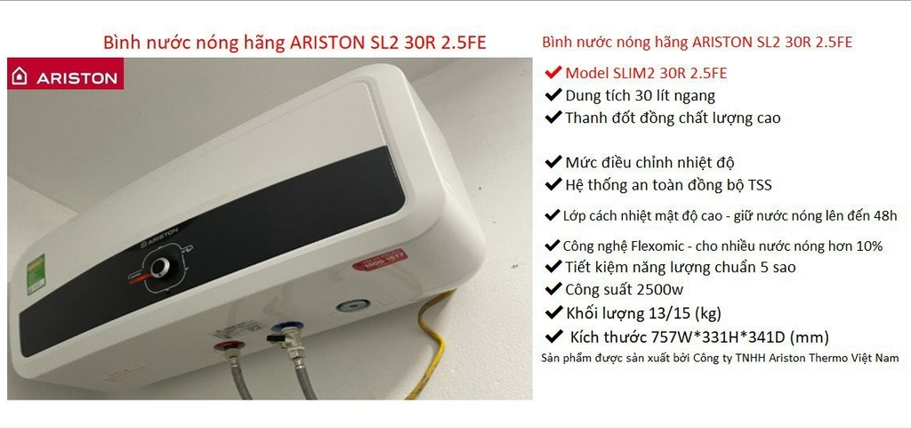 Bình nóng lạnh Ariston ngang SL2 30R= 2800k
